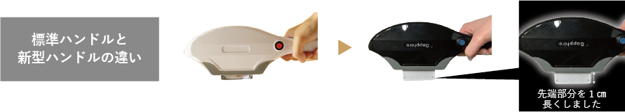 ハンドピース先端部分をクリスタル素材からサファイア素材への変更で、更に冷却レベルがアップし、ロングタイプになったことでよりVIOや顔等の細かい箇所の照射が快適になりました。